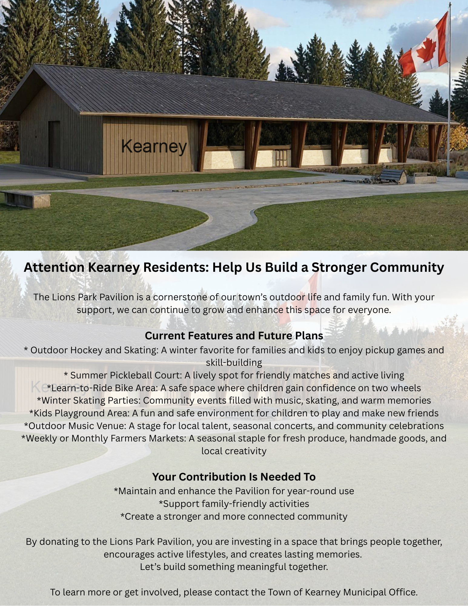 • Etransfer - To donate via e-transfer, please send your contribution to payment@townofkearney.ca. Use Kearney as the answer to the security question. In the memo section, be sure to include your full name, mailing address, and indicate that the donation is for the Lions Pavilion Project.